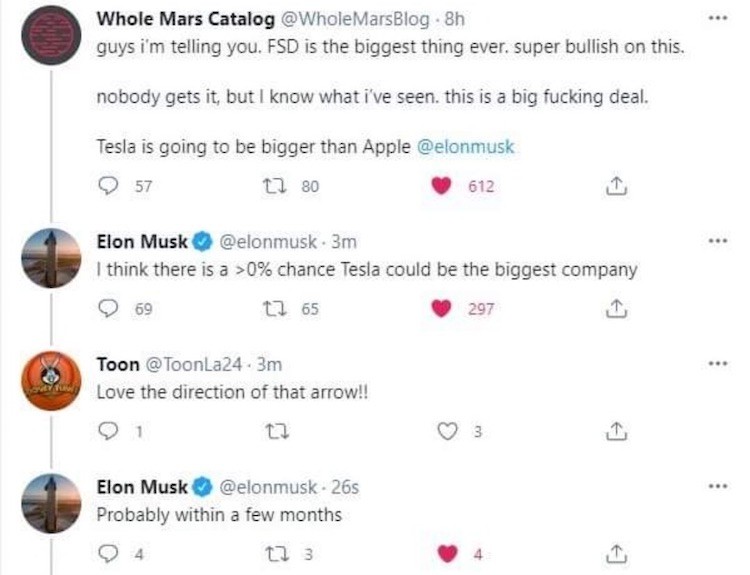 Маск сьогодні написав у Twitter наступне: «Я думаю, що шанси Tesla стати найбільшою у світі компанією вище нуля», а потім додав: «Ймовірно, це станеться в найближчі місяці». Другий твіт пізніше був вилучений, проте скріншоти з ним залишилися в інтернеті навічно.