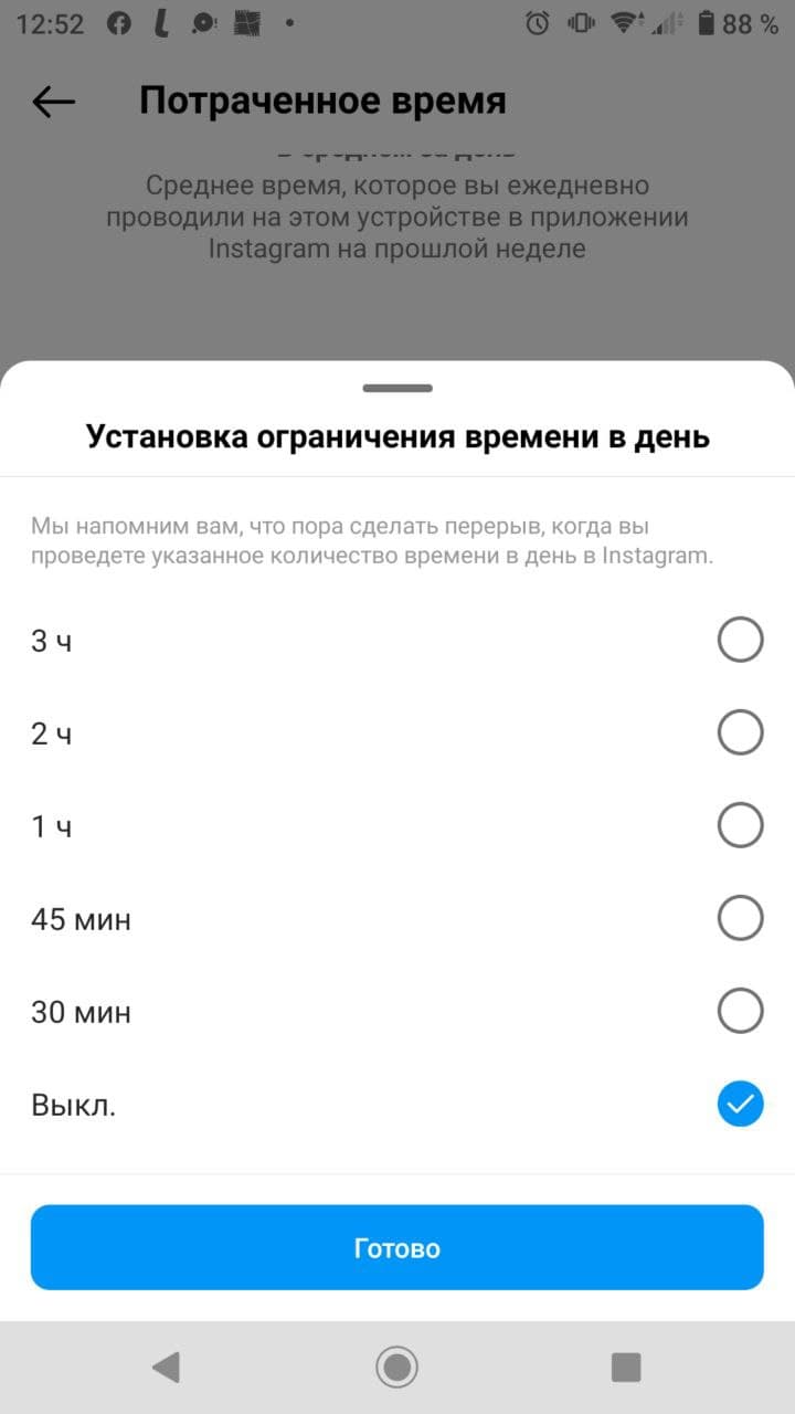 Ще у 2018 році компанія оголосила про запровадження спеціальної функції для деяких регіонів. Користувачі, які надто захоплюються переглядом стрічки в Instagram, могли задати тимчасовий проміжок, через який вони будуть отримувати повідомлення, що нагадують про необхідність відволіктися на іншу діяльність. Але якщо раніше мінімальний тимчасовий відрізок становив 15 або навіть 10 хвилин на день, то тепер він збільшений до 30 хвилин. Доступні й інші варіанти, що дозволяють використовувати програму до 3 годин без нагадувань, або не включати їх зовсім.