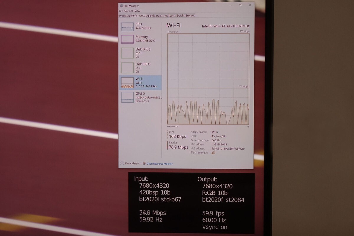 Один з авторів видання TechHive був присутній на демонстраційному показі в Лос-Анджелесі. Потік транслювався через гігабітний роутер по Wi-Fi 6E на комп’ютер під керуванням Windows 10. На комп’ютері були встановлені один 18-ядерний процесор Intel Xeon W-2295, 64 Гбайт оперативної пам’яті та 1-терабайтний SSD-диск Intel. Декодування відео в реальному часі проводилося плеєром Spin Digital V2.2.2, після чого відправлялося на 75-дюймовий 8K-телевізор по інтерфейсу HDMI 2.1 з відеокарти NVIDIA GeForce RTX 3080. Марку і модель телевізора Intel також не уточнила. На виході загальна затримка при трансляції з Японії в Лос-Анджелес становила від 2,5 до 4 секунд.