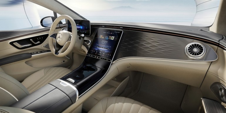 Інтер’єр електромобіля Mercedes-Benz EQS з величезним 55-дюймовим екраном Hyperscreen