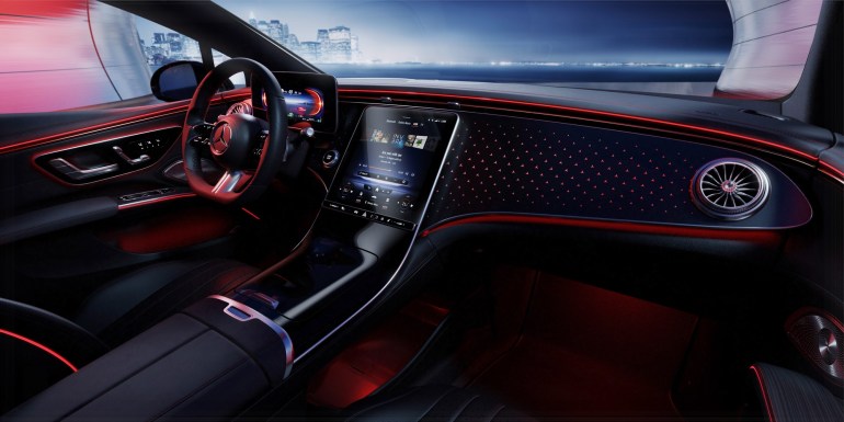 У темний час доби в салоні автоматично включається підсвічування, яке робить інтер’єр Mercedes-Benz EQS ще більш футуристичний.