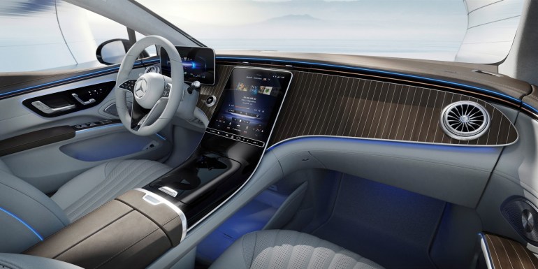 Інтер’єр електромобіля Mercedes-Benz EQS з величезним 55-дюймовим екраном Hyperscreen