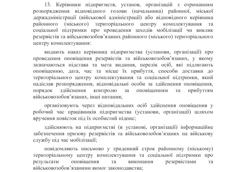 - видають наказ керівника підприємства (установи, організації) про проведення оповіщення резервістів та військовозобов’язаних, у якому зазначаються підстава та мета видання, перелік осіб, які підлягають оповіщенню, дата, час та місце їх прибуття, способи доставки до ТЦК, який надіслав розпорядження, відповідальні особи за здійснення оповіщення,