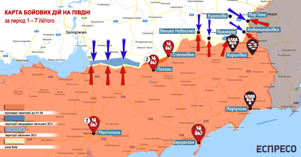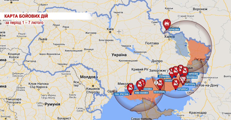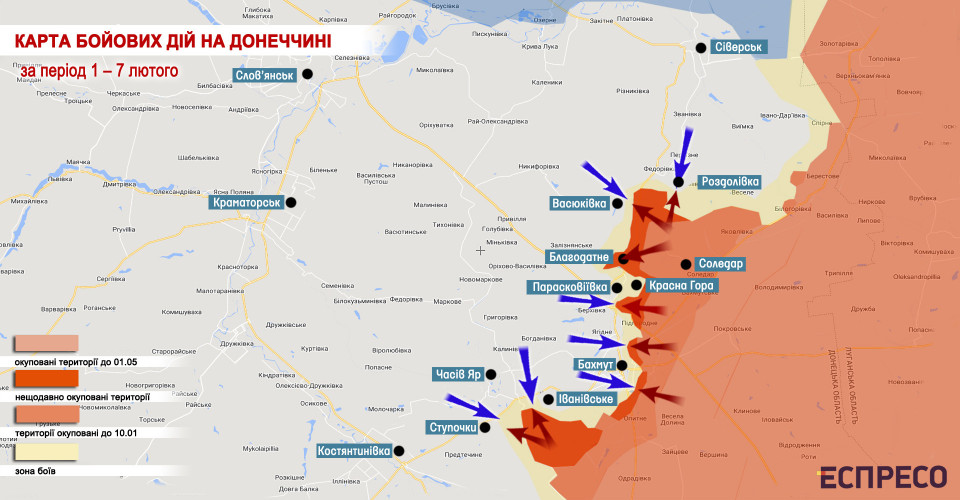 Карта бойових дій за період 1-7 лютого. Бій за Часів Яр визначить долю Бахмута