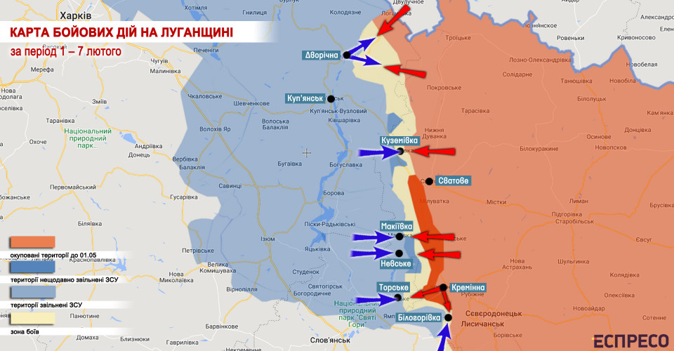 Широкомасштабний наступ, якого очікують чи то через 10 днів, чи то через 3 місяці, насправді вже триває понад 2 тижні не тільки в Бахмуті, а й на Луганщині. Тут росіяни активізувалися практично на всій ділянці фронту. В районі Дворічної загарбники ведуть бої, щоб отримати тактичну перевагу перед наступом на Куп’янськ. Біля Сватового наші воїни дещо покращили ситуацію для себе та зайняли позиції в районі залізничної станції в селі Куземівка.