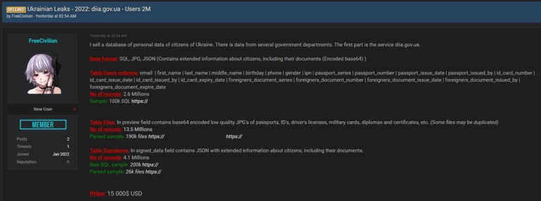 Новий користувач форуму опублікував запис про продаж бази персональних даних громадян України. Він заявляє, що володіє базами даних кількох державних відомств. Першою він виставив на продаж базу даних сервісу diia.gov.ua. Вона містить відомості про ПІБ, адресу електронної пошти, дату народження, номер телефону, стать, індивідуальний податковий номер, дані паспорту або ID-карти, закордонного паспорта. База налічує близько 2,6 млн записів. Продавець пропонує можливість ознайомитися з невеличким фрагментом бази даних, який містить відомості про 100 тис. користувачів «Дії».