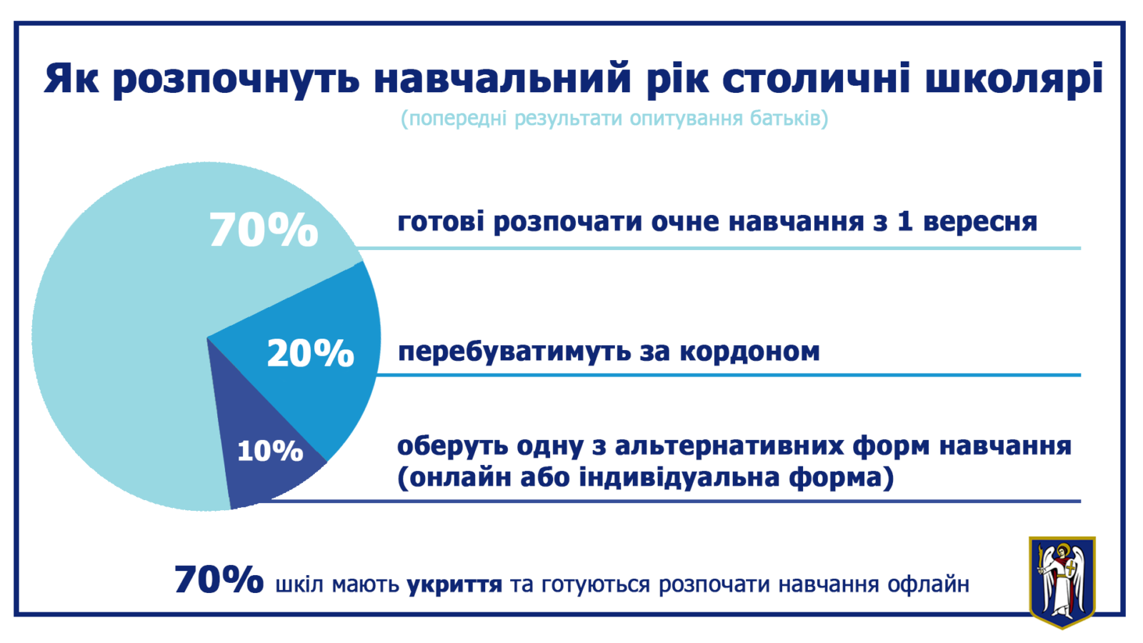 «За нашими попередніми підрахунками, за кордоном на 1 вересня перебуватимуть майже 20 відсотків столичних школярів. Майже 70% дітей, відповідно до опитування батьків, готові до очного навчання.