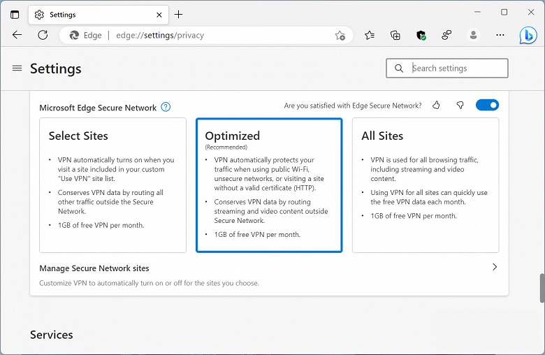 Варто зазначити, що вибрати сервер у конкретній державі світу в Edge Secure Network не можна. Користувачам браузера доступні три режими роботи VPN: для всіх веб-ресурсів, для обраних і “оптимізований”. У разі активації “оптимізованого” режиму браузер проганятиме весь трафік через VPN під час підключення до веб-ресурсів із простроченими сертифікатами, а також до незахищених і загальнодоступних мереж.