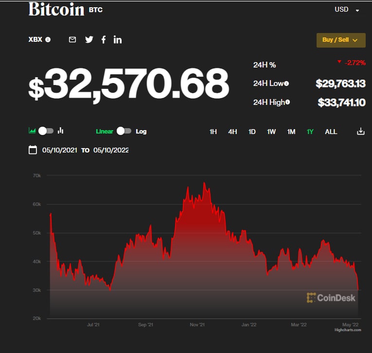 Криптовалюта за ринковою капіталізацією впала до позначки $30 331, знижуючи п’яту сесію поспіль. Востаннє біткоїн упав на 9,8% до $30 724.