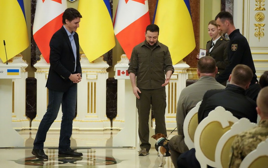 «У присутності пана Прем’єр-міністра Канади Джастіна Трюдо, нагородив сьогодні наших саперів, зокрема й малого, але дуже відомого сапера Патрона. Собаку, який допомагає очищенню нашої землі від слідів окупантів. І який допомагає також вчити дітей протимінної безпеки. Через російських загарбників це тепер одне з найбільш актуальних завдань – навчити дітей впізнавати вибухонебезпечні предмети та уникати їх. Ось таке «звільнення» від безпечного життя для українських дітей Росія принесла в Україну», – каже Зеленський.