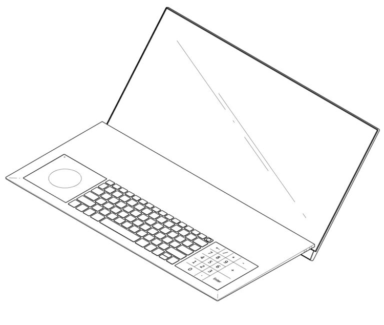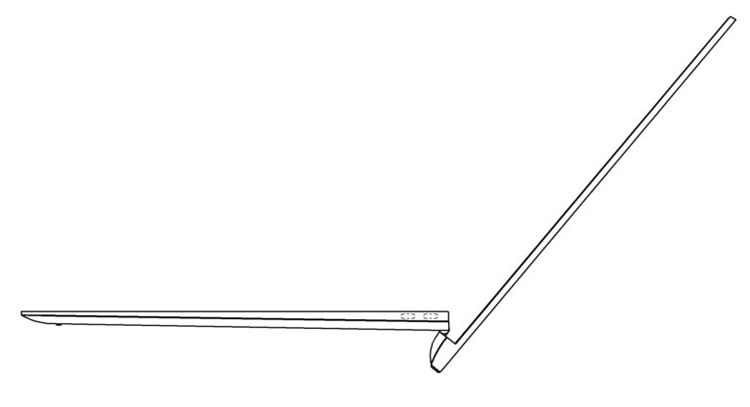 Як можна бачити на ілюстраціях, конструкція ноутбука передбачає наявність основного широкоформатного екрану на верхній кришці. Особливе кріплення при відкритті лептопа підніматиме задню частину бази, що дозволить покращити охолодження і збільшити комфорт при наборі текстів.