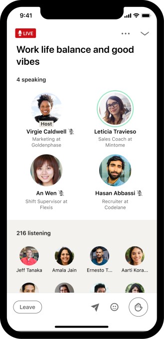 LinkedIn планує запустити бета-тест нової функції голосових чатів найближчим часом. Нижче представлений макет того, як може виглядати користувальницький інтерфейс майбутнього голосового чату LinkedIn, яким платформа поділилася з ресурсом TechCrunch. Як і в Clubhouse, у верхній частині вікна розташовані спікери, нижче – аудиторія слухачів.