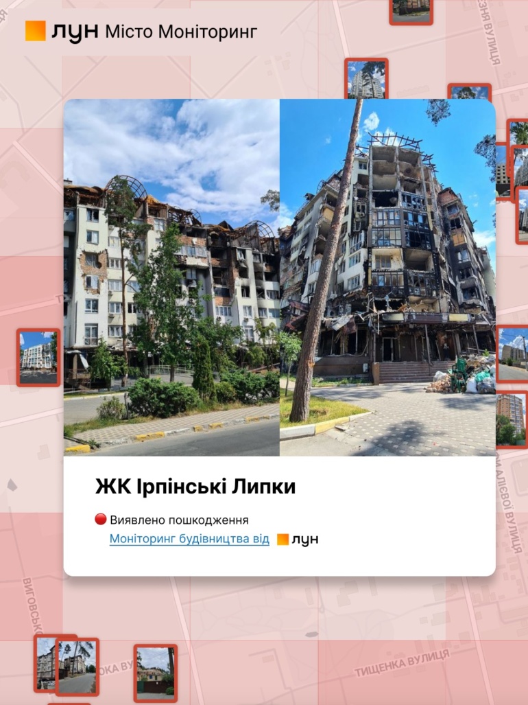 На новоствореній Карті Моніторингу зібрані фотозвіти будинків, що були побудовані після 2010-го року на частині Київської області, що зазнала вторгнення. Так, за результатами моніторингу за червень та липень, близько 74% новобудов Бучі, Ірпеня та Гостомеля мають невідремонтовані ураження різного ступеню.