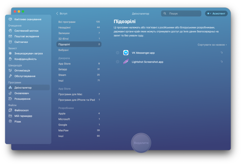 Якщо будь-яка з програм, встановлених на вашому комп’ютері Mac, розроблена в росії чи білорусі, CleanMyMac X позначає їх як підозрілі. Щоб перевірити, чи встановлені такі програми на вашому комп’ютері::