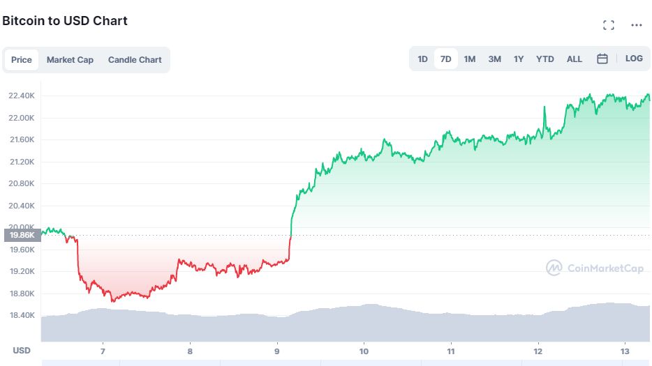Загальна капіталізація зросла на 1,2% до $1,07 трлн завдяки 13-відсотковому зростанню біткоїнів за останні сім днів. У годинному діапазоні цифровий актив демонструє невелике зростання і вказує на $23 тис. після максимуму понеділка в $22,5 тис. Але спочатку він має перевищити 200-денне рухоме середнє, згідно з технічним аналізом.