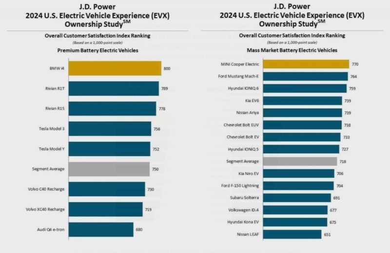 Згідно з результатами недавнього опитування, електромобілями з найвищим рівнем задоволеності з боку власників у преміальному сегменті є: BMW i4 (800 балів), Rivian R1T (789 балів), Rivian R1S (778 балів), Tesla Model 3 (756 балів), Tesla Model Y (752 бали), Volvo XC40 Recharge (719 балів), Audi Q4 e-tron (680 балів).