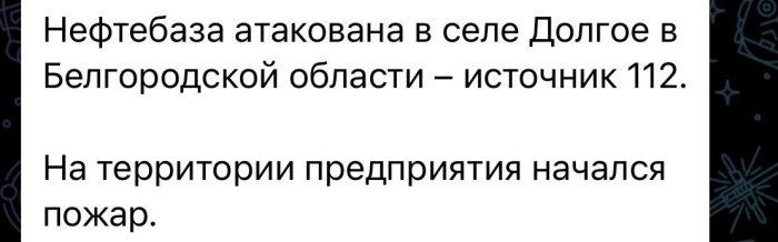 Як пишуть російські телеграм-канали, була атакована нафтобаза, яка знаходиться в селі Довге Губкінського району Бєлгородської області рф.