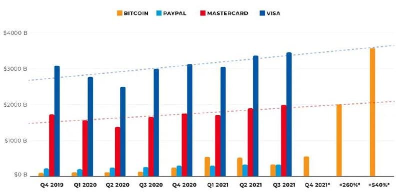 Звіт від 25 листопада від платформи ринкової аналітики Blockdata під назвою “Коли мережа біткоїн зможе обробляти такі обсяги, як Mastercard та Visa?” вказує, що мережа біткоїн обробляла близько 489 мільярдів доларів на квартал у 2021 році, що більше, ніж 302 мільярди доларів у Paypal. Усього через 12 років існування біткоїн обробляє близько 27% від 1,8 трильйона доларів Mastercard на квартал і 15% від 3,2 трильйона доларів Visa.