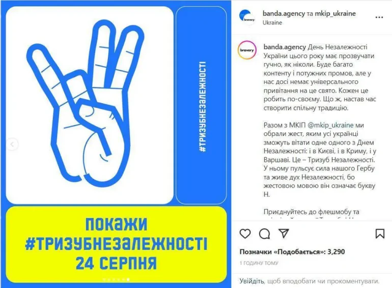 «Проте ваші коментарі переконали нас у тому, що сила тризубу Чорновола є беззаперечною. Ми поважаємо цю позицію і пропонуємо використовувати той жест тризуба, який вам подобається. Не забувайте лише додавати хештег #ТРИЗУБНЕЗАЛЕЖНОСТІ», — йдеться у повідомленні Banda Agency.