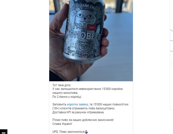 У жовтні минулого року Monobank повідомив про випуск монопива, яке назвав «кращим банківським пивом у світі». Сьогодні клієнти банку змогли отримати його абсолютно безкоштовно.