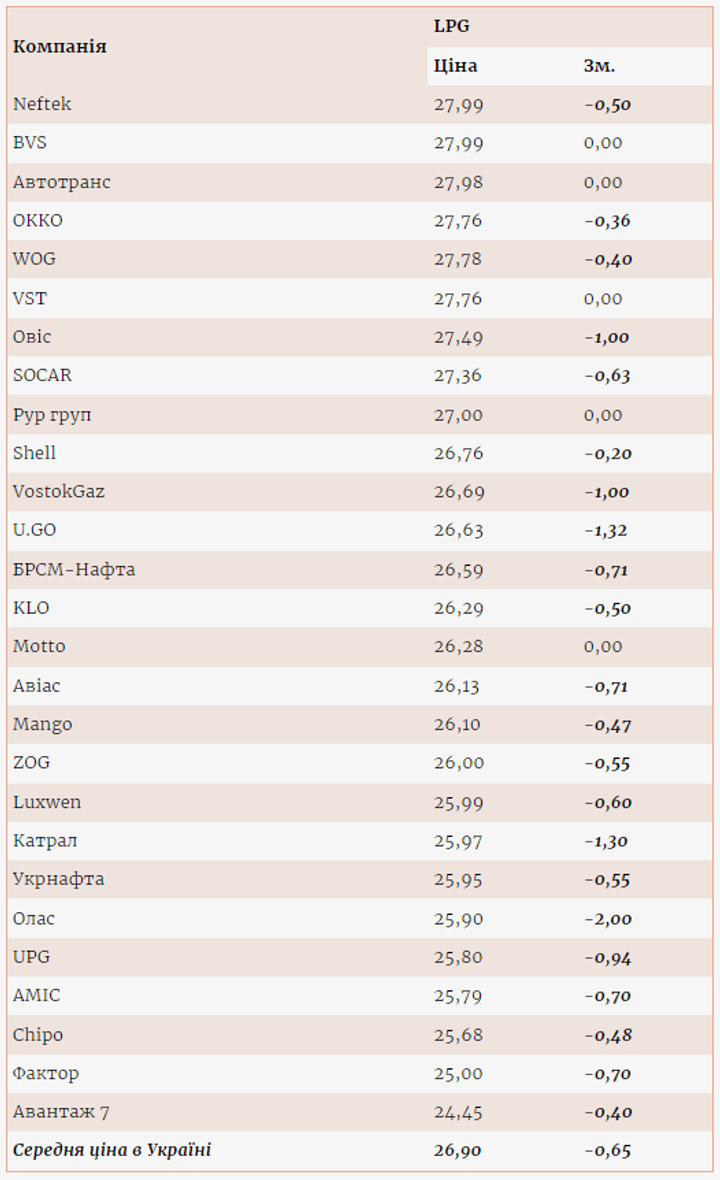 Як видно з таблиці, діапазон цін коливається у межах 24,45–27,90 грн/л. При цьому на станціях WOG і ОККО автогаз здешевшав на 0,40 грн/л і 0,36 грн/л, до 27,78 грн/л і 27,76 грн/л відповідно.