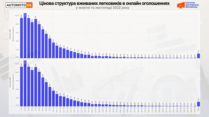 Абсолютну більшість оголошень продажу на українському ринку надалі складають легковики вартістю до $10 тисяч. Порівняно з жовтнем, частка таких машин у листопаді майже не змінилася: вони надалі складають абсолютну більшість — 76% від загальної кількості. Найбільша кількість пропозицій продажу знаходиться в категорії $1-2 тисячі: 10,8% (у жовтні показник був на рівні 10,6%).