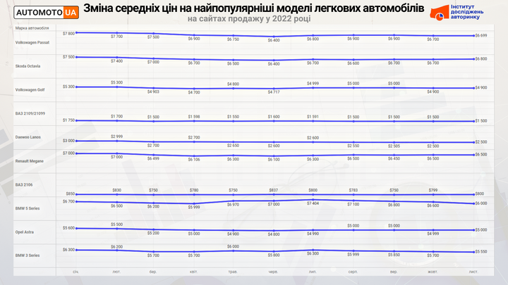 Зміна середніх цін на найпопулярніші моделі легкових автомобілів на сайтах продажу у 2022 році