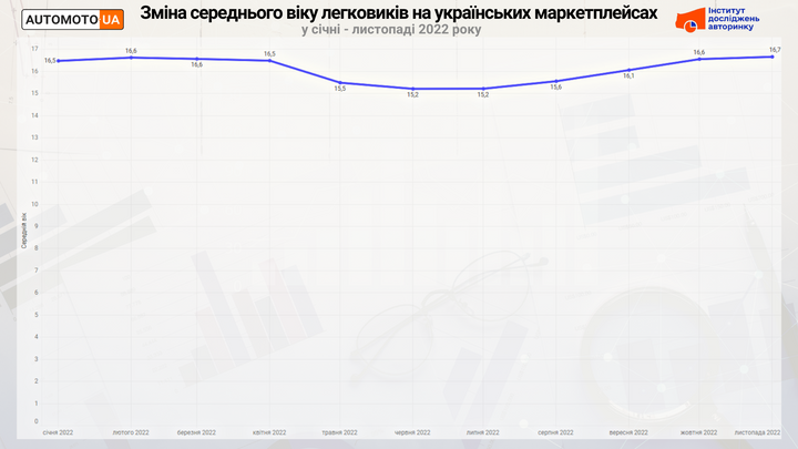 У червні та липні, коли на ринку була максимальна кількість пропозицій продажу «свіжопригнаних» автомобілів без сплати митних платежів, середній вік машин в оголошеннях продажу складав 15,2 року — це найнижчий показник у 2022 році. У листопаді цей показник виявився навпаки максимально високим: 16,7 року. Тобто, автомобільний ринок України продовжує старіти — уже четвертий місяць поспіль, з моменту скасування так званого «нульового» розмитнення.