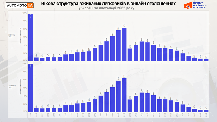 Продовжує збільшуватися кількість легковиків, випущених після 1992 року (тобто старше 30 років): їх частка зросла з 11,7% у жовтні до 12% в листопаді. Це також максимальний показник у 2022 році.