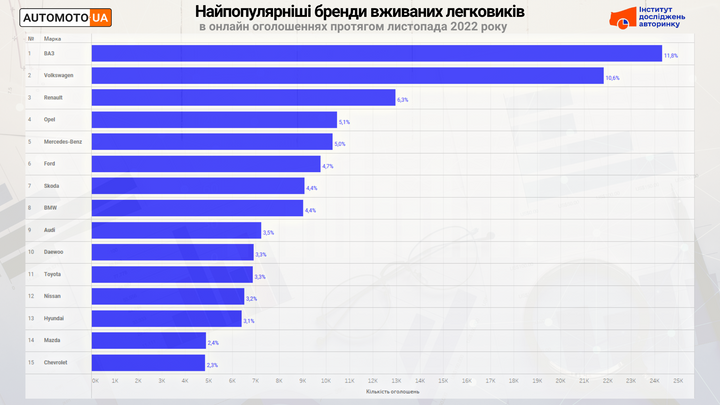 Як помітно з рейтингу брендів, радянсько-російські автомобілі марки ВАЗ збільшують свою частку серед оголошень продажу в інтернеті. У листопаді їх було вже 11,8% — це максимальний показник цієї марки у 2022 році. Ще у червні таких авто було 7,2%, а перше місце займав Volkswagen з часткою 11,5%. У листопаді авто цієї марки залишилися на другому місці із часткою 10,6%. На третьому місці в рейтингу розмістилися легковики Renault (6,3%).