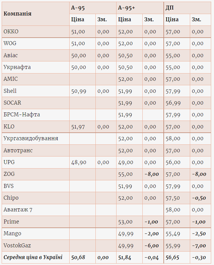 Зокрема, в запорізькій мережі ZOG бензин марки А-95 з покращеними показниками якості й дизельне пальне здешевшали на 8 грн/л, до 55,00 грн/л і 57 грн/л відповідно. Мережа Prime знизила вартість цих продуктів на 1 грн/л, до 53,00 грн/л за бензин і до 57 грн/л – за дизпальне.