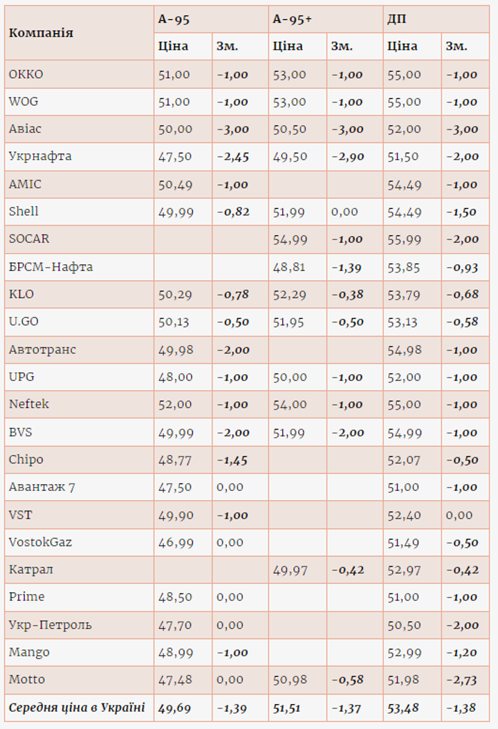 Зокрема на 3 грн/л пальне здешевшало у мережі «Привату» («Авіас», ANP й інші): бензин А-95 — до 50 грн/л, А-95+ — до 50,50 грн/л, ДП — до 52,00 грн/л. На 2,00-2,90 грн/л ціни опустила мережа «Укрнафти», яка до націоналізації компанії була неформальною частиною «Привату». Там зараз бензини коштують 47,50-49,50 грн/л, ДП — 51,50 грн/л.