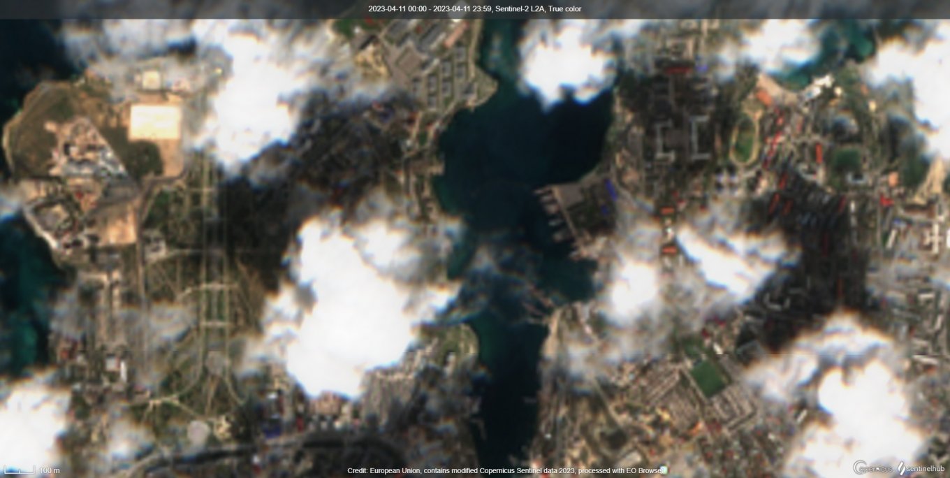 На низькоякісному публічному супутниковому знімку від Sentinel, який був зроблений 11 квітня (на жаль більш свіжі знімки демонструють лише щільну хмарність) видно, що російські військові кораблі знаходяться у причальної стінки.