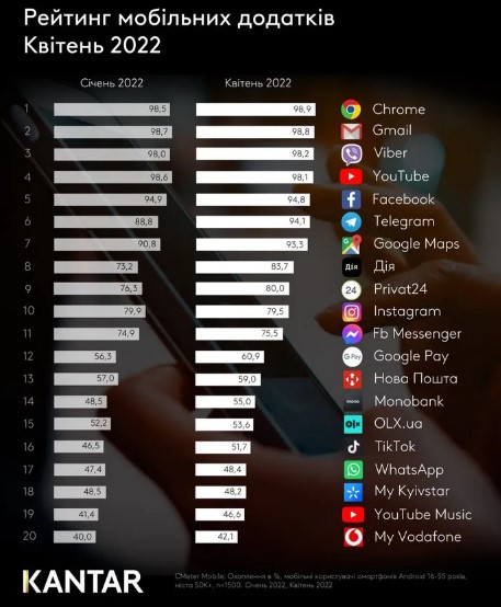 Chrome, Gmail, Viber майже завжди є трійкою лідерів серед мобільних застосунків. Також українці продовжують вирішувати повсякденні завдання зі смартфона, користуючись послугами Нової пошти, OLX, Uklon Taxi, Сільпо та Helsi.me. Проте нині частота використання таких застосунків знизилася. Відповідно, через події в Україні інтерес користувачів до інтернет-магазинів також знизився.