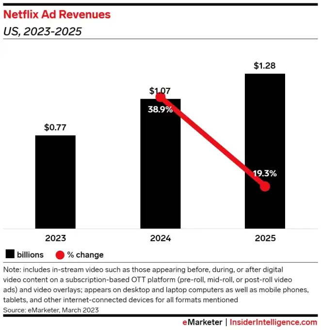За даними Insider Intelligence, цього року Netflix отримає $770 млн доходів від реклами, а у 2024 році ця цифра зросте до $1,9 млрд.