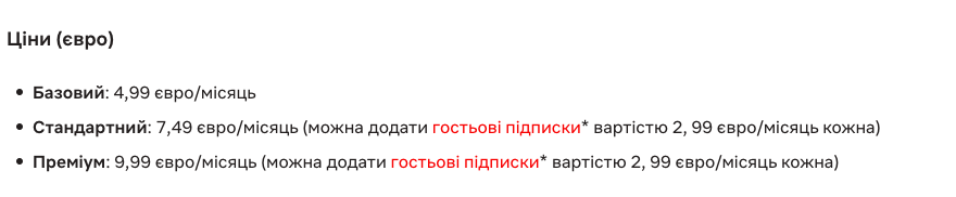 Користувачам Netflix залишається варіант за $15,49 на місяць без реклами. В іншому випадку передплатникам доведеться платити $6,99 на місяць за базовий план з підтримкою реклами або $22,99 на місяць за преміумрівень, передає The Verge. Відзначимо, що в Україні наразі є три варіанти підписки:
