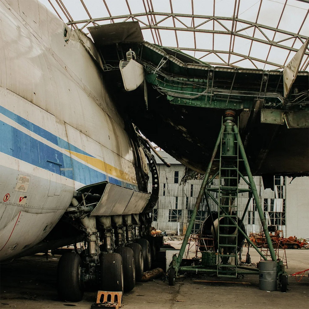 До деяких елементів основної частини фюзеляжу найбільшого літака у світі встановили домкрати – вони допомагають підтримувати пошкоджені конструкції.