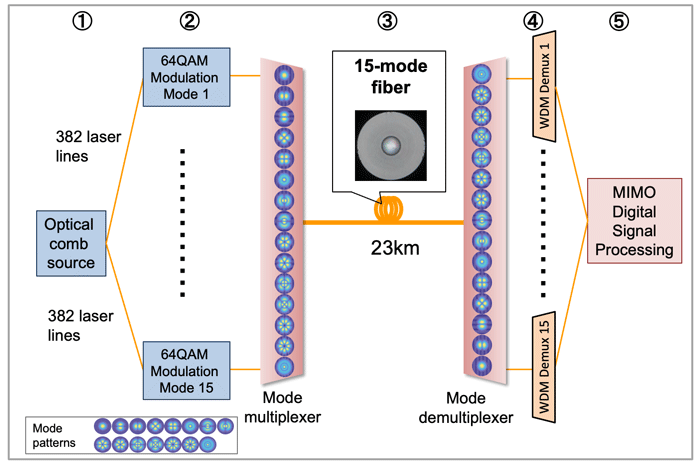 У NICT був проведений експеримент по передачі даних, в якому використовувалося 125-мк оптоволокно виробництва Prysmian та багатомодові мультиплексори, розроблені Bell Labs. Широкосмуговий приймач був розроблений в NICT для роботи з декількома сотнями каналів WDM, забезпечуючи при цьому високу якість сигналу. Принцип роботи нових мультиплексорів заснований на багатоплощинному процесі перетворення світла, при якому 15 вхідних сигналів багаторазово відбиваються від фазової пластини, щоб відповідати режимам передачі для відповідного оптоволокна.