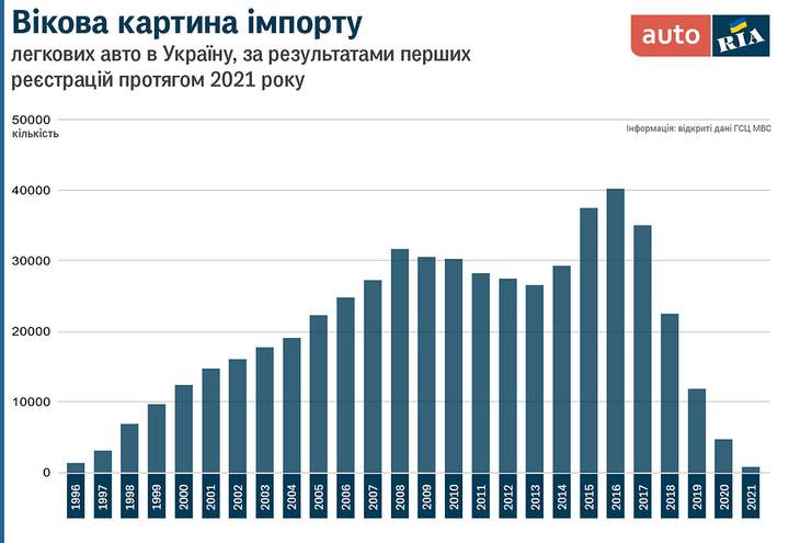 Автівок з роком випуску далі 1996 немає, бо саме тоді був запроваджений екостандарт “Євро-2”, який є мінімальним прохідним на даний час для імпорту легкових машин. Зростання діаграми від 1996 до 2008 року випуску спричинене двома факторами. Перший – віковий коефіцієнт у формулі акцизу, де чим старіше авто, тим більший розмір цього податку. Другий – природне зниження інтересу покупців до автівок більшого віку.