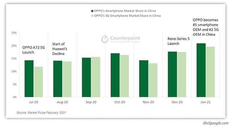Згідно з даними дослідницької компанії Counterpoint Research, OPPO збільшила свою присутність на ринку смартфонів Китаю до 21 відсотка. До неї впритул наближається Vivo, якій належить 20 відсотків ринку. Третю позицію ділять відразу три компанії. Huawei, Apple і Xiaomi займають по 16 відсотків. Counterpoint зазначає, що OPPO збільшила свої продажі на ринку Китаю на 26 відсотків у порівнянні з минулим роком. Також повідомляється, що понад 65 відсотків усіх смартфонів, проданих в Китаї в четвертому кварталі 2020 року, підтримують 5G.