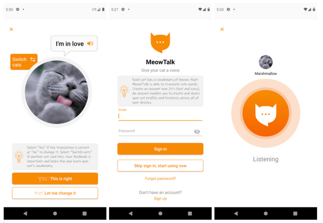 MeowTalk записує звуки, які видає кицька і пропонує переклад на мову людей. Наприклад, фрази “погодуй мене” або “у мене щось болить”. А зважаючи на те, що у котів немає “єдиної мови”, кожен може розвивати свій власний “словниковий запас”. Тому користувач може сам навчити додаток розуміти конкретну тварину.