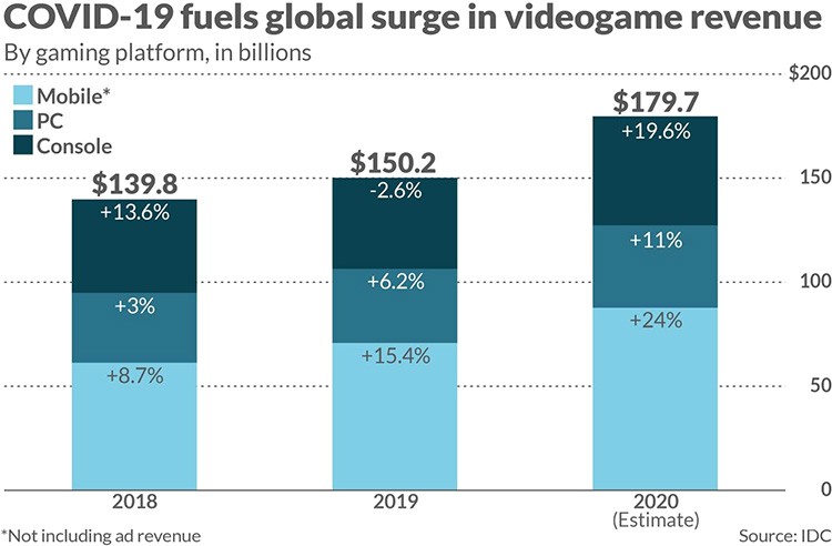 Однак обидві ці галузі помітно постраждали від наслідків пандемії COVID-19 у 2020 році, в той час, як індустрія відеоігор, навпаки, демонструє зростання, який виражається у відсотках двозначними цифрами. Експерти прогнозують, що у 2021 році стрімке зростання продовжиться завдяки недавньому запуску нового покоління ігрових консолей Sony та Microsoft і новим іграм — навіть коли заходи карантину будуть зняті.