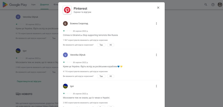 На сторінці застосунку Pinterest у розділі відгуків — велика кількість негативних оцінок. Користувачі нагадують адміністрації Pinterest, що Крим був та завжди буде частиною Україною (та і нещодавні події у Херсоні лише додають впевненості щодо цього). В Україні користувачі вже обвалили рейтинг Pinterest до 1.0 на підставі 9,37 млн оцінок.