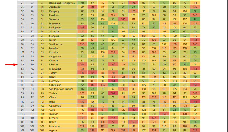 В загальному рейтингу Україна розмістилась між Киргизстаном (90 поз.), Гаяна (південна Америка 91 позиція) та Сальвадором і Туреччиною (відповідно 93 і 94 позиції).