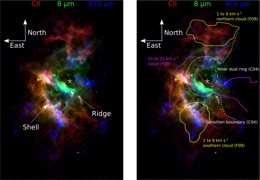 Знімок зоряного скупчення Вестерлунда 2 (Wd2) в декількох діапазонах довжин хвиль (виділені квітами) із зазначеними на ньому масивними молодими зірками (зірочки). Праворуч – окреслені окремі хмари газу, а також розірвався «бульбашка» (біла часта пунктирна лінія) і внутрішнє кільце пилу (біла рідкісна пунктирна лінія) / © https: //doi.org/10.3847/1538-4357/abf6ce