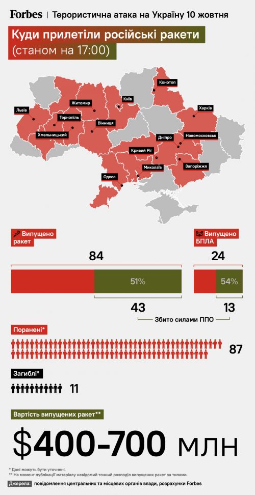 Видання «Forbes Україна» оцінило вартість випущених росією ракет за 10 жовтня. За інформацією журналістів на 17:00 10 жовтня, було запущено 84 крилаті ракети та 24 безпілотники. Їхня середня загальна вартість – $400-700 млн.