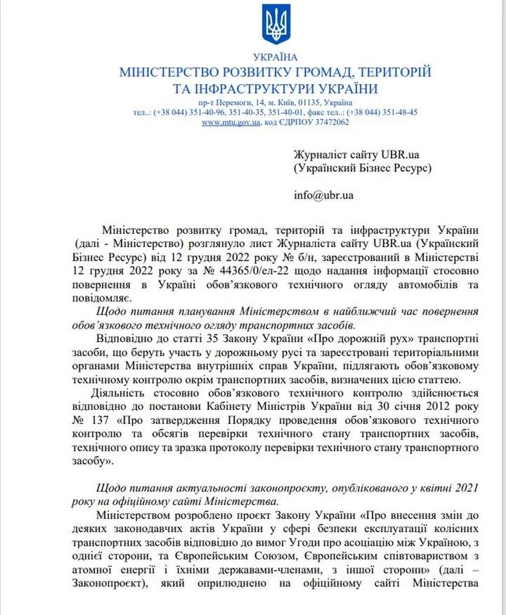 Міністерство розвитку громад, територій та інфраструктури не ініціюватиме повернення обов’язкового техогляду (ТО) для некомерційних легкових автомобілів до завершення воєнного стану. Це випливає з відповіді відомства на запит видання UBR
