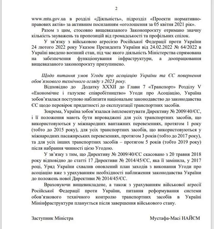 Як пояснюється у відповіді, підписаній заступником голови МГТІ Мустафою-Масі Найємом, опублікований у квітні 2021 року законопроект “отримав значну кількість зауважень від громадськості та профільних спілок”. Його доопрацювання на цей момент припинено через те, що під час воєнного стану діяльність відомства має бути сконцентрована на забезпеченні функціонування інфраструктури.