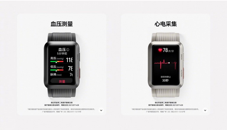 Huawei Watch D навіть отримали сертифікацію як медичний пристрій від Управління з санітарного нагляду за якістю харчових продуктів та медикаментів Китаю. Годинник отримав спеціальні ремінці з вбудованою мініатюрною манжеткою, як у звичному тонометрі. Пристрій забезпечує точність +/- 3 мм ртутного стовпа як у більшості автоматичних тонометрів.