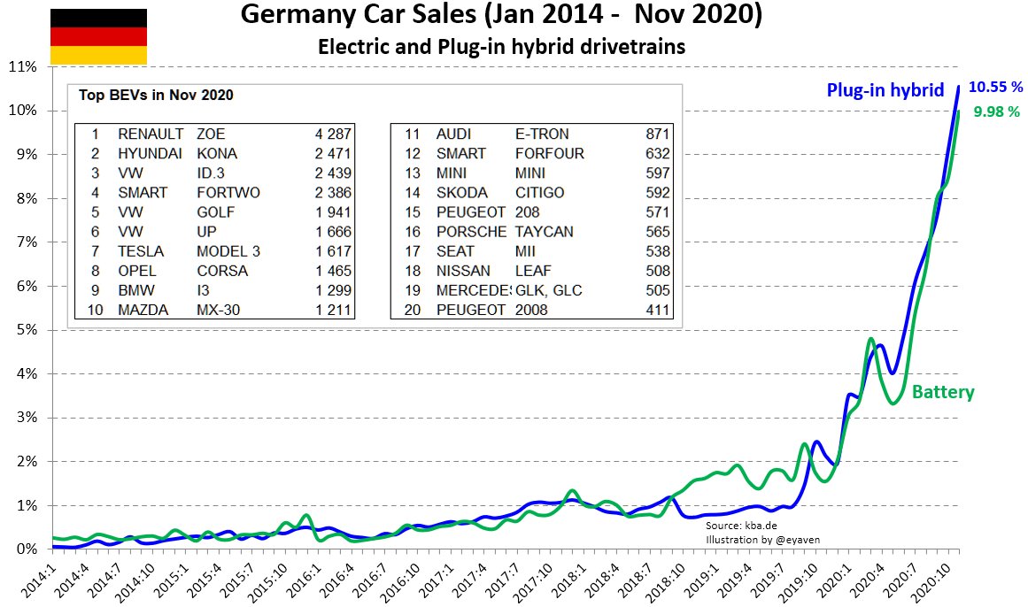 Список найбільш популярних в Європі моделей повністю електричних автомобілів включає Renault Zoe, Hyundai Kona EV, VW ID.3, Smart Fortwo, VW e-Golf, VW e-Up, Tesla Model 3, Opel Corsa E, BMW i3 та Mazda MX-30. Цікаво, що шість з цих десяти моделей недоступні в Північній Америці.